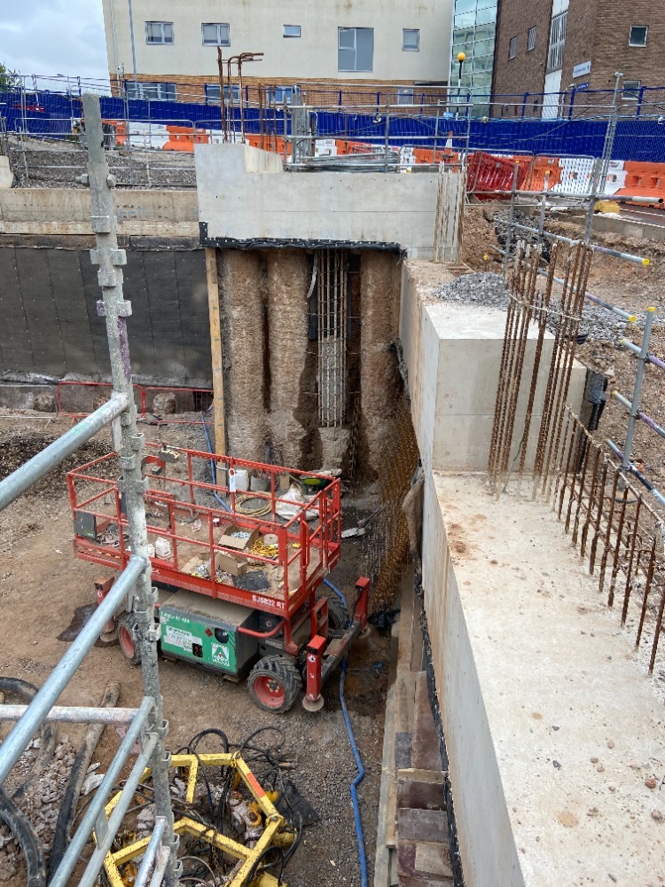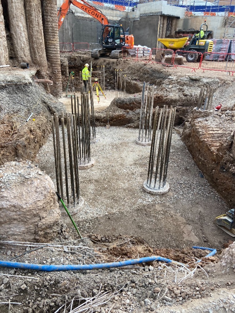 • Crane bases and pits with temporary works shoring structures and large steel cages.